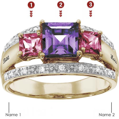 The Winter Solstice ring has three princess cut birthstones with two rows of cubic zirconia accents, all set in 14k yellow gold. Engrave up to 12 characters in each of two engraving areas. The princess cut center stone is 6mm and the side stones are 4mm. 2.3mm. Imported.