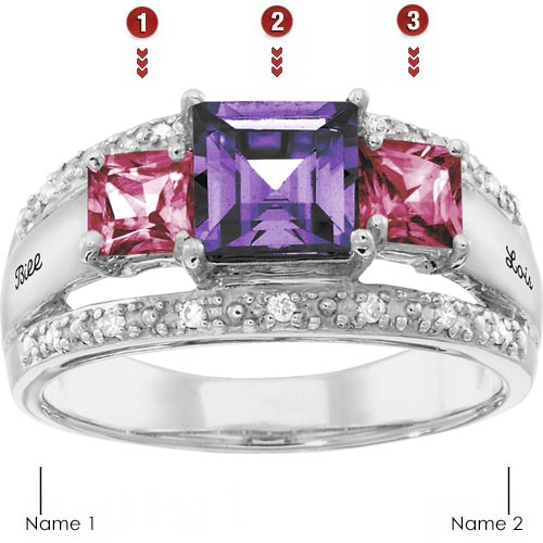 The Winter Solstice ring features three genuine princess cut birthstones with two rows of cubic zirconia accents in polished sterling silver. Engrave up to 12 characters in each of two engraving areas. The princess cut center stone is 6mm and the side stones are 4mm. 2.3mm. Imported.