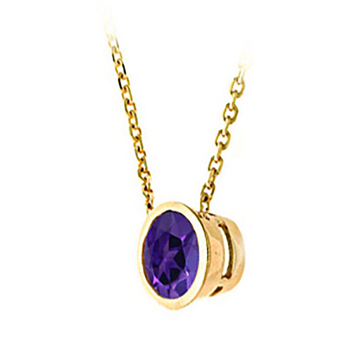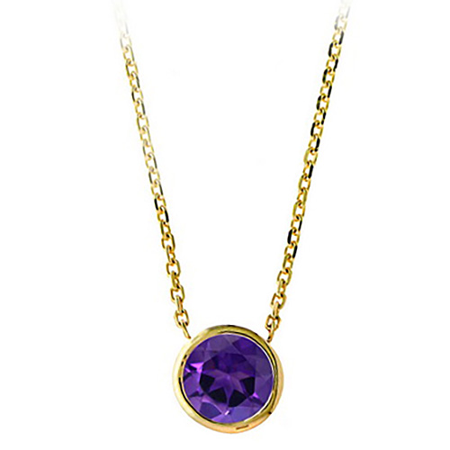 14k yellow gold 0.9 ct round amethyst solitaire necklace has a spring ring clasp. 6.5mm round amethyst, AA quality. Bezel set. 14k yellow gold 16in cable chain has a spring ring clasp. Made in USA.