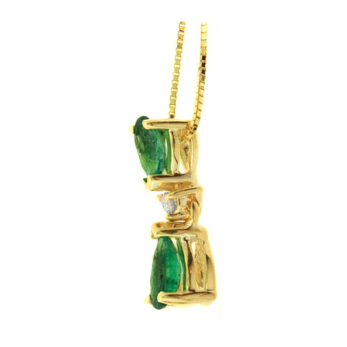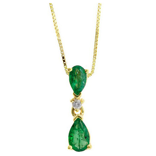 Two-stone pear cut emerald and diamond necklace is made of 14k yellow gold. Two genuine pear shaped emeralds, 0.6 carat total weight, AA quality. Genuine round full cut diamond, .02 carat total weight, I1-I2 clarity, H-I color. 14k yellow gold 16in cable chain has a spring ring clasp. Made in USA.