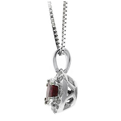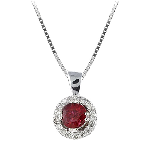 14k white gold 0.3 carat ruby halo necklace has diamond accents. The genuine round ruby is 4mm, AA quality. Genuine round single cut diamonds, .06 carat total weight, I1-I2 clarity, H-I color. 14k white gold 16in cable chain has a spring ring clasp. Made in USA.