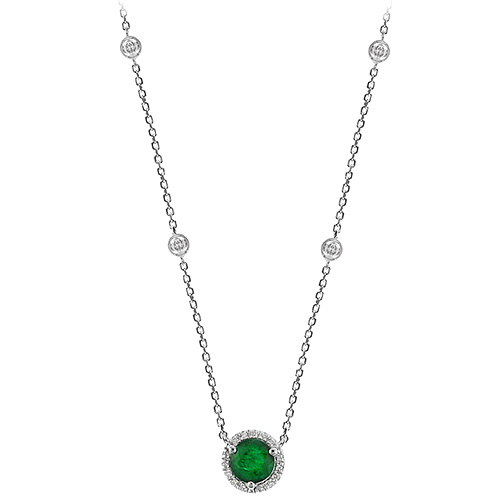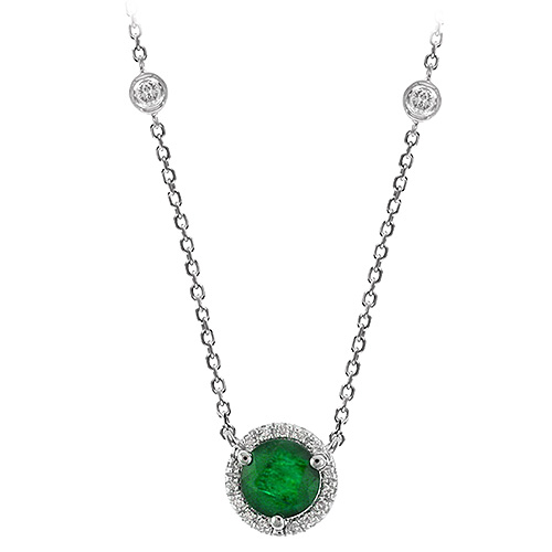 14k white gold 1 carat round emerald halo necklace has diamond accents. The genuine round emerald is 6.5mm, AA quality. Genuine round full cut diamonds, .10 carat total weight, I1-I2 clarity, H-I color. Four diamond bezel set stations. 14k white gold 16in cable chain has a spring ring clasp. Made in USA.