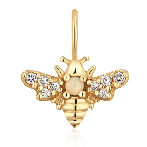 Aurelie Gi 14k yellow gold honey bee charm has genuine round white sapphire and opal accents. Item size: 8.1mm x 8.4mm. Jump ring size: 4 x 2.6mm. Opal size: 1.5mm. White sapphire size 0.8mm and 0.9mm. Made in China. Ships from USA.