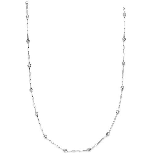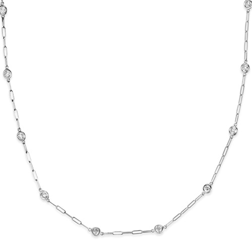 This 2.0 ct tw diamond bezel station paper clip necklace is made of solid 14k white gold. Diamond details: 14 round full cut diamonds, SI2 clarity, G-H color, eye clean. 14k white gold paper clip link chain has a lobster clasp. Necklace length: 18in. Made in USA.