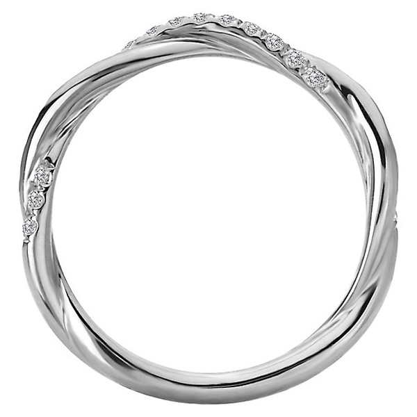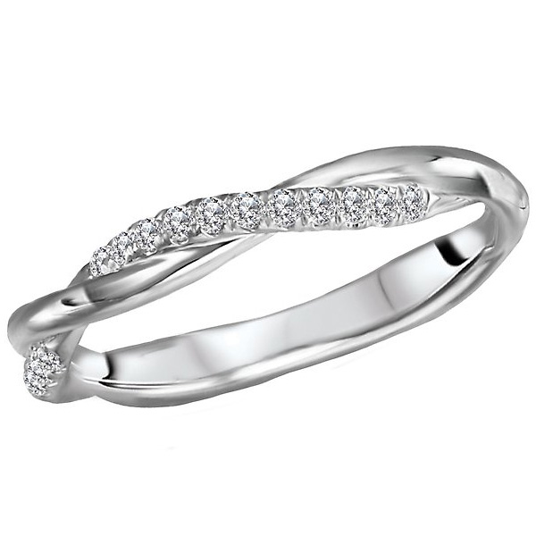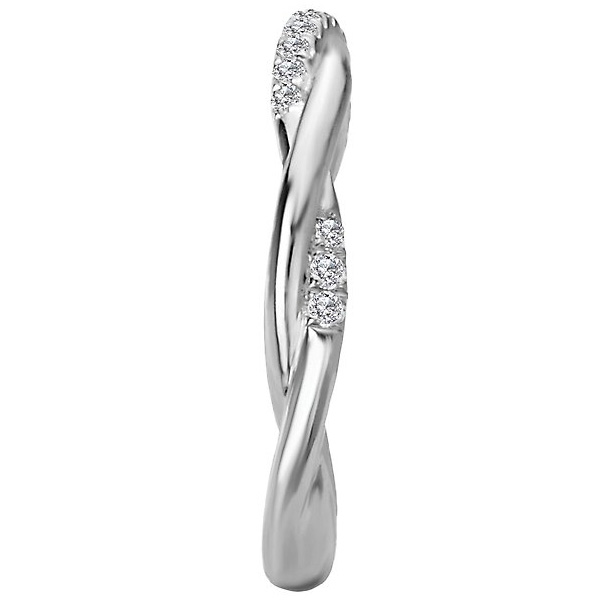 This 14k white gold diamond twist ring features diamond accents in a swirling pattern. 17 genuine round full cut diamonds, 0.16 carat total weight, SI1-SI2 clarity, H-I color. Standard fit. Size 7 weighs approximately 2.7 grams. Made in USA.