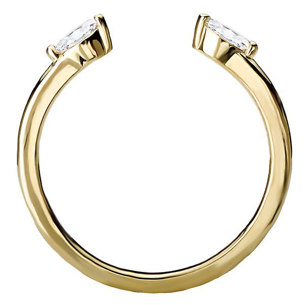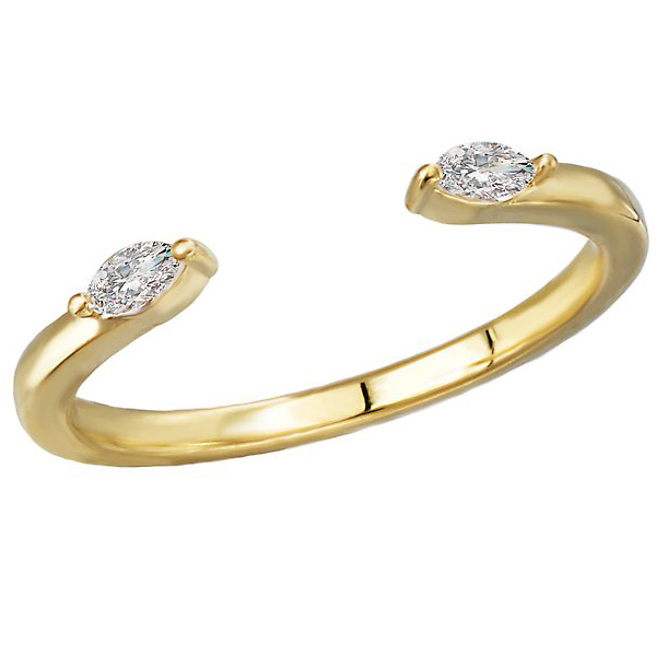 Marquise-cut diamond open cuff ring is made of solid 14k yellow gold. Two genuine marquise cut diamonds, 0.14 carat total weight, SI1-SI2 clarity, H-I color. Standard fit. Size 7 ring weighs approximately 1.9 grams. Made in USA.