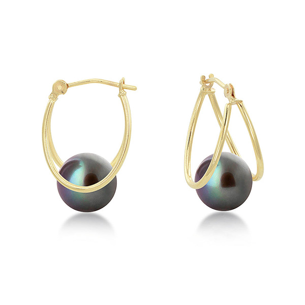 The black freshwater cultured pearls seem to float between 14k yellow gold hoops. Each AA quality pearl is 8mm in diameter. Earring length: 3/4in. Wire and clutch closure. Ships from USA.