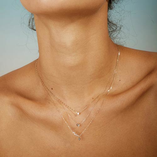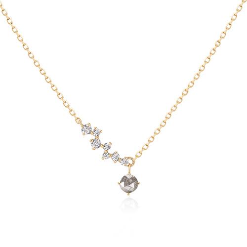 Aurelie Gi 14k yellow gold gray diamond and white sapphire necklace has a constellation design. JCK 2023 award winner. One genuine round full-cut gray diamond, 3mm. Four round white sapphires, 1.6mm / 1.3mm / 1.2mm / 1.1mm. The slender 14k yellow gold cable chain is adjustable in length from 16in to 18in. Chain width: 0.7mm. Spring ring clasp. Made in China. Ships from USA.