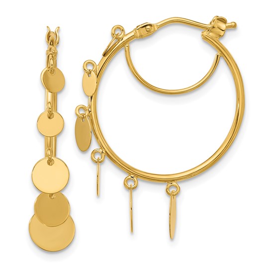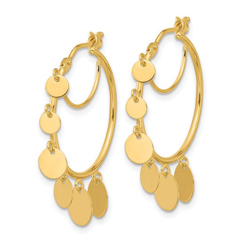 Herco 14k yellow gold graduated disc hoop earrings are polished on both sides. The dangling disc accents grow in size from top to bottom. Earring dimensions: 0.85in x 1.1in. Wire and clutch closure. Approximate weight: 2.4 grams. Made in Italy. Ships from USA.
