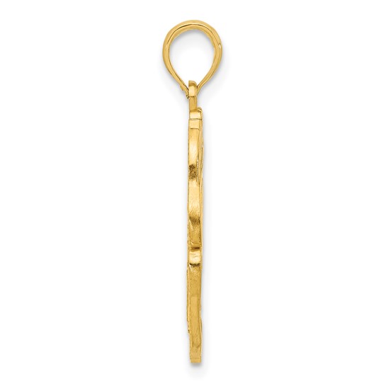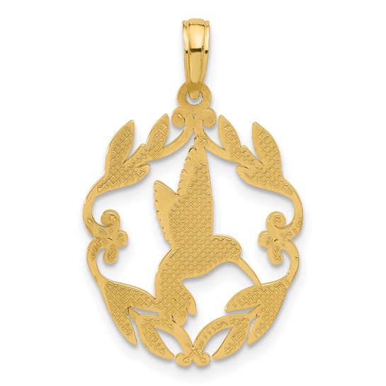 This solid 14k yellow gold hummingbird floral pendant has a polished finish. Item size: 11/16in x 3/4in. Fits up to a 3.5mm wide chain. Weight: 2.1 grams. Made in USA.