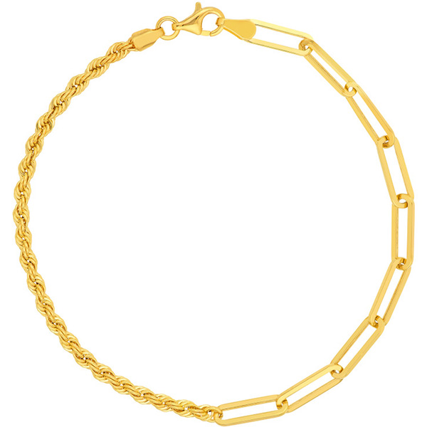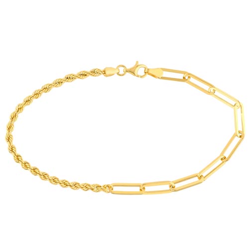 Mixed paper clip and rope chain bracelet is made of 14k yellow gold. Bracelet length: 7.5in. The rope is 2.7mm wide, and the paper clip links are 3.8mm wide. Lobster clasp. Approximate weight: 2.0 grams. Made in Turkey. Ships from USA.
