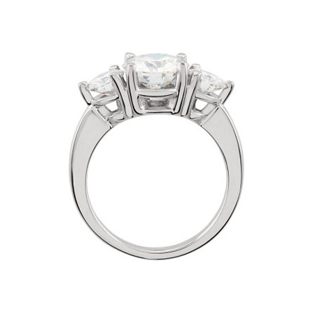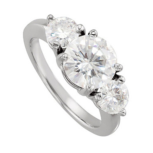 This classic 3 carat three-stone Forever One moissanite ring is crafted in polished 14k white gold. One 8mm round and two 5mm round moissanite jewels (3 CT TW), prong set. Carat weight listed is diamond equivalent weight. Ring weighs approximately 4.84 grams. Moissanite! Born from a star this stunning jewel has a brilliant past. Originally discovered in celestial asteroids, Moissanite has a fire, brilliance and luster greater than the finest diamonds.