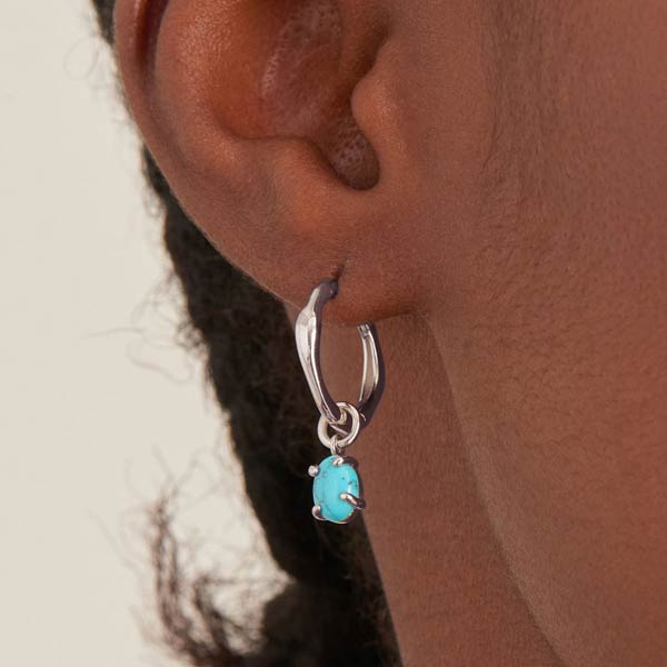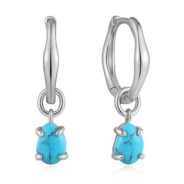These sterling silver Ania Haie wavy huggie hoop earrings have dangling oval created turquoise gemstones. Hoop diameter: 15.5mm. Oval turquoise stone size: 5mm x 7mm. Part of the Making Waves collection. Designed in London and made in China. Approximate weight: 3.1 grams. Ships from USA.