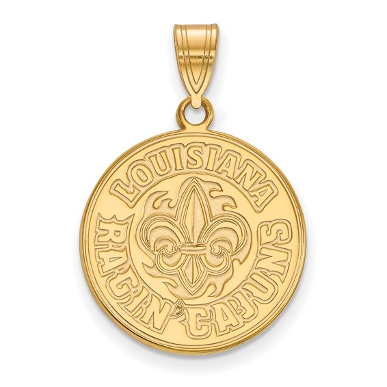 This University of Louisiana at Lafayette pendant is made of polished solid 14k yellow gold. Item size: 3/4in x 3/4in. Fits up to a 3mm chain. Officially licensed jewelry. Approximate weight: 2.8 grams. Made in the USA.