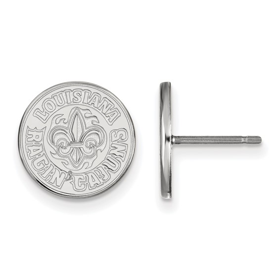 Louisiana Ragin Cajuns disc earrings are made of polished sterling silver. Earring size: 1/2in x 1/2in. Posts with push on / pull off backs. Officially licensed jewelry. Approximate weight: 2.3 grams. Made in the USA.