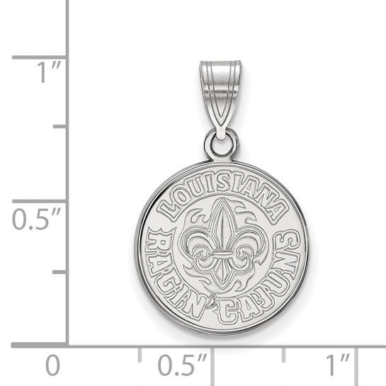 This small University of Louisiana at Lafayette pendant is made of polished solid 14k white gold. Item size: 5/8in x 5/8in. Fits up to a 3mm chain. Officially licensed jewelry. Approximate weight: 2.0 grams. Made in the USA.