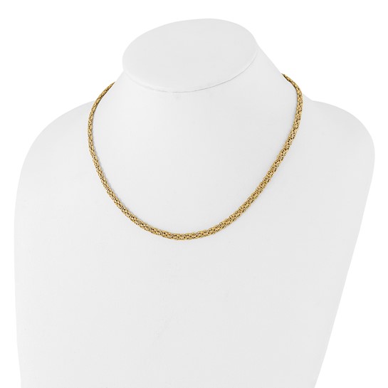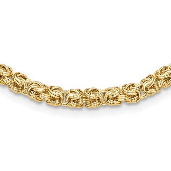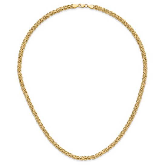 This solid yet lightweight 14k yellow gold Byzantine necklace has a fancy lobster clasp. Necklace length: 18 inches. The necklace is 4.25mm wide. Approximate weight: 5.6 grams. Made in Peru. Ships from USA.