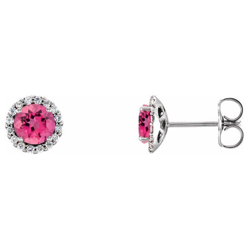14k white gold 1.1 ct round pink tourmaline halo earrings have genuine diamond accents. Earring size: 7.3mm x 7.3mm. Pink tourmaline details: 5mm round, AA quality, .55 ct each. 32 round full cut diamonds, 1/8 carat total weight, G-H color, I1 clarity. Posts with push on / pull off backs. Approximate weight: 0.9 grams. Ships from USA.