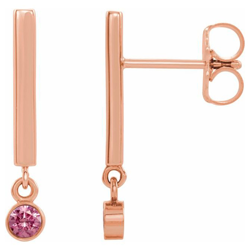 14k rose gold bar dangle earrings have round pink tourmaline accents. Earring size: 18.6mm x 1.8 mm. Pink tourmaline details: 2.5mm round, AA quality, .08 ct each. Posts with push on / pull off backs. Approximate weight: 0.8 grams. Ships from USA.
