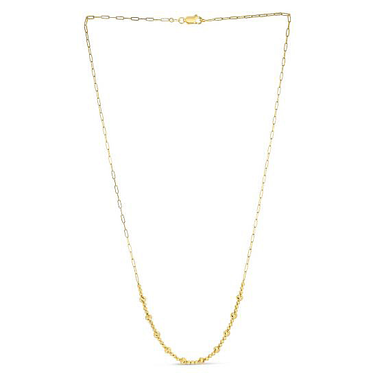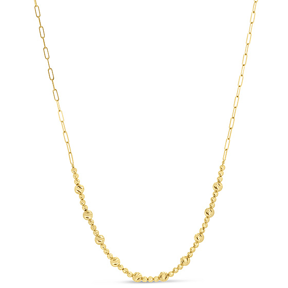 Mixed bead and paper clip link chain necklace is made of 14k yellow gold. Necklace length: 18in. Diamond-cut beads vary in size. Lobster clasp. Approximate weight: 3.5 grams. Made in Turkey. Ships from USA.