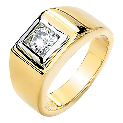 This 14k two tone gold men's Forever One moissanite ring has a wide shank. It features one 6.5mm round Forever One moissanite jewel. The equivalent diamond weight is 1 carat total weight. Ring top width: 10.7mm, palm width: 5.1mm. Ring weighs approximately 16.78 grams. Made in the USA.