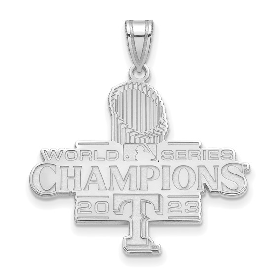 This men's Texas Rangers World Series 2023 champions pendant is made of polished sterling silver. Item helight: 1in without bail. Officially licensed MLB jewelry. Fits up to a 3.5mm wide chain. Officially licensed. Approximate weight: 6.7 grams. Made in the USA.