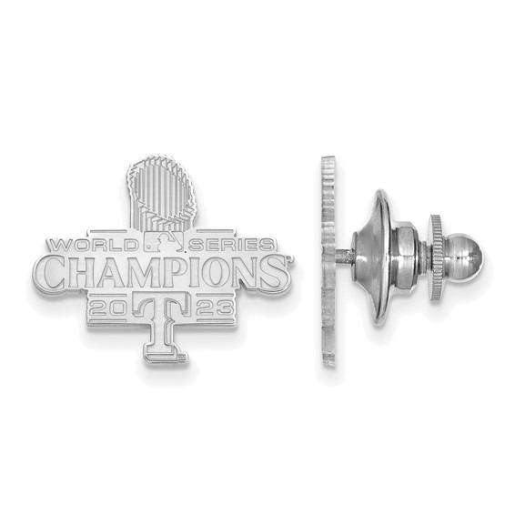 Texas Rangers World Series 2023 champions tie tac is made of solid sterling silver. Item size: 3/4in x 5/8in. Officially licensed MLB jewelry. Approximate weight: 3.1 grams. Made in the USA.