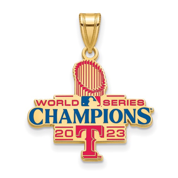 Texas Rangers World Series 2023 champions pendant is made of blue and red enamel and gold-plated sterling silver. Item size: 3/4in x 5/8in. Officially licensed MLB jewelry. Fits up to a 4mm wide chain. Officially licensed. Approximate weight: 3.3 grams. Made in the USA.