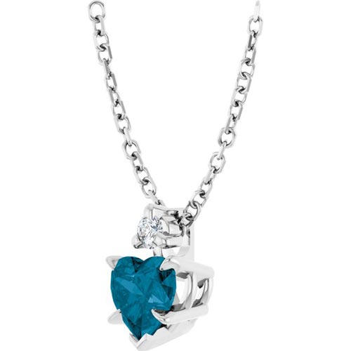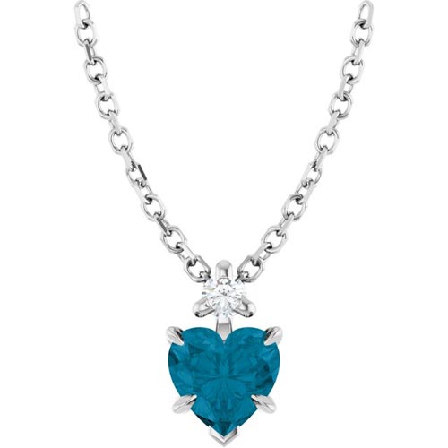 14k white gold London blue topaz heart necklace has .03 carat total weight diamond accents. Blue topaz size: 5mm x 5mm. One round single cut diamond, I1 clarity, G-H color. 14k white gold 16in to 18in adjustable cable chain has a lobster clasp. Approximate weight: 1.7 grams. Made in the USA.