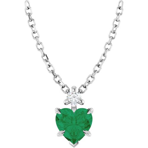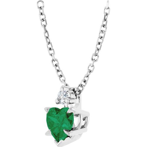 14k white gold lab-created emerald heart necklace has .03 carat total weight diamond accents. Lab-created emerald size: 5mm x 5mm. One round single cut diamond, I1 clarity, G-H color. 14k white gold 16in to 18in adjustable cable chain has a lobster clasp. Approximate weight: 1.7 grams. Made in the USA.
