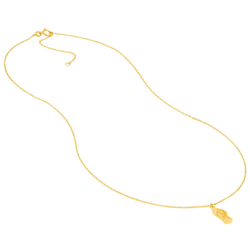 This adorable petite flip flop necklace is made of polished solid 14k yellow gold. The flip flop pendant dangles from a slender adjustable 16 to 18in loose rope chain with spring ring clasp. Pendant length: 1/2in. Chain width: 0.75mm. Approximate weight: 1.2 grams. Made in Turkey. Ships from USA.