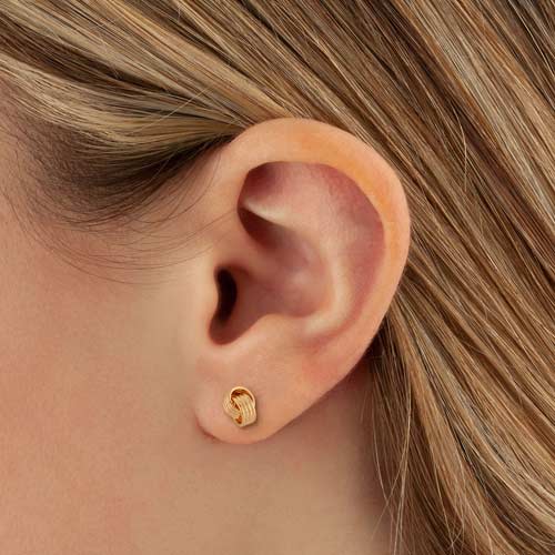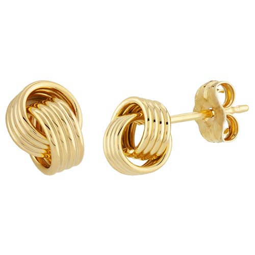 These small 14k yellow gold colied love knot earrings have a bright polished finish. 3-dimensional. Earring size: 1/4in x 1/4in. Posts with push on / pull off backs. Approximate weight: 1.2 grams. Made in USA. Enjoy manufacturer's lifetime guarantee against defects.