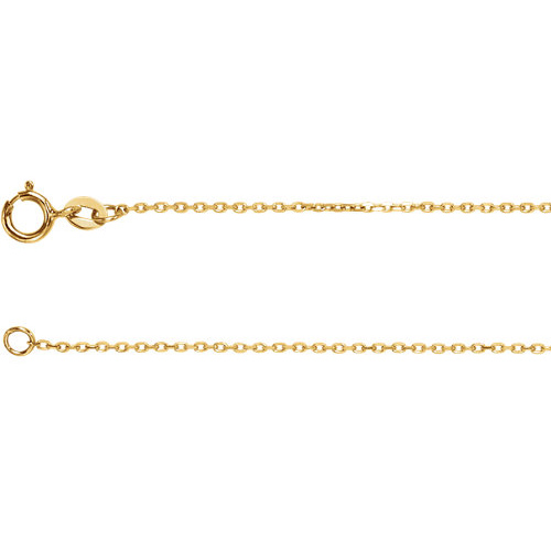 Polished solid 14k yellow gold cable chain has a springlock clasp. Width: 1mm. Length: 18 inches. Weighs 1.60 grams. Please note: weight is approximate, actual weight may vary.