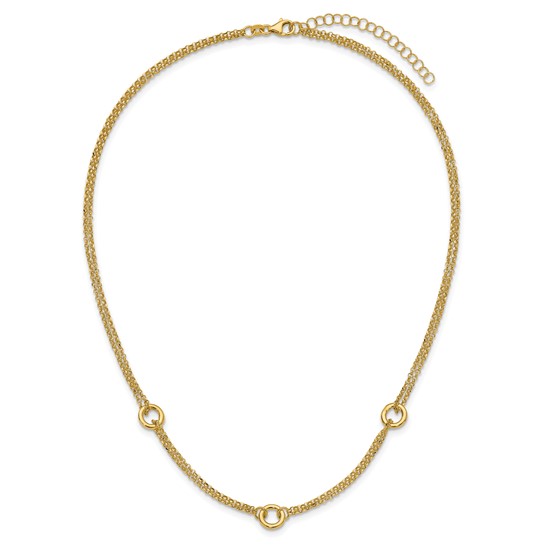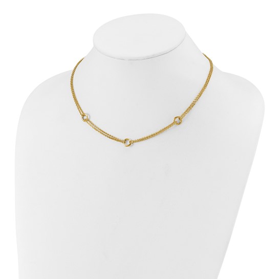 Two strand circle link necklace has a fancy lobster clasp. Necklace is adjustable in lenth from 17in to 19in. Circle charm siize: 8.5mm. Chain width: 1.3mm. Approximate weight: 6.2 grams. Made in Italy. Ships from USA.