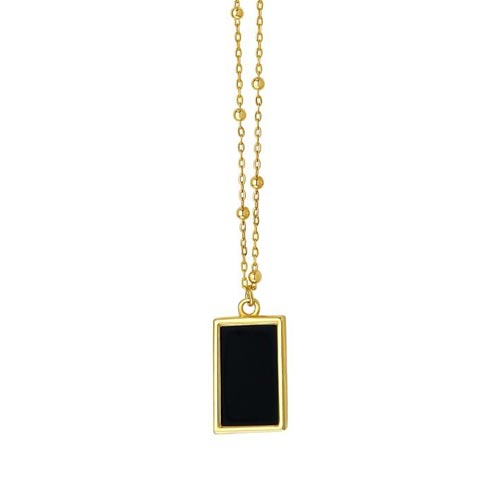 This solid 14k yellow gold black onyx bar necklace has a spring ring clasp. 1.2 carat rectangular black onyx, 6.8mm x 11.2mm. Necklace length: 18 inches. Approximate weight: 1.5 grams. Made in Turkey. Ships from USA.