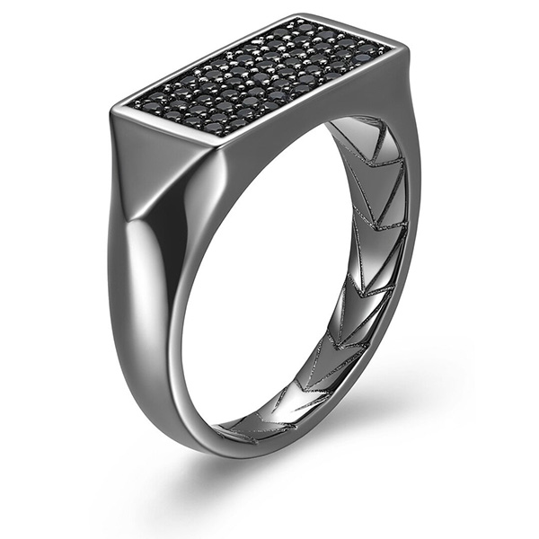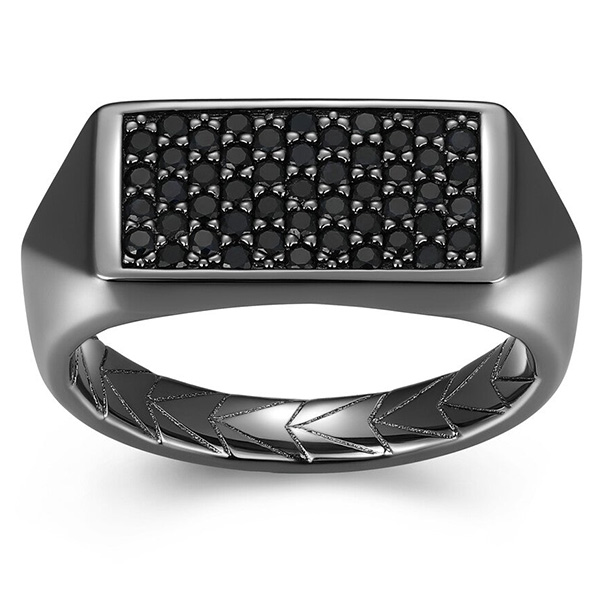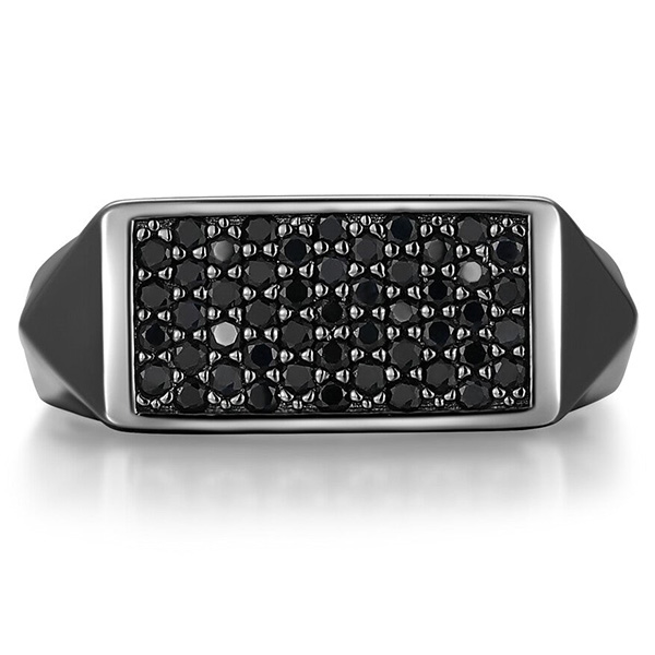Ethos men's black ice rectangular signet ring is made of solid sterling silver. It is encrusted with genuine black sapphire accents on top. Available in whole finger sizes 9, 10, and 11. Standard fit and closed back. Import. Ships in a black jewelry box with pouch. Import. Ships from USA.