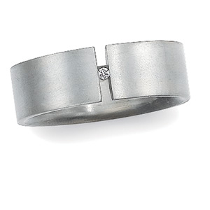 Polished titanium wedding band with .02CT round diamond. Diamond color F, SI1 clarity. Tension set. Ring width: 8mm. Brushed finish. Hypoallergenic, comfort fit styling. Size 10 weighs 4.13 DWT (6.42 grams) Please note: weight is approximate, actual weight may vary.