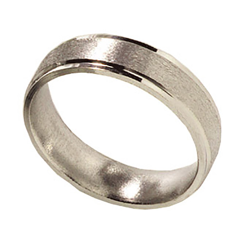 Ti™ stone finish titanium wedding band with flat grooved edges. Ring width: 6mm. Hypoallergenic, comfort fit styling. Limited lifetime guarantee: All Ti™ jewelry is guaranteed for life. If a piece should EVER fail structually, it will be replaced at no charge.