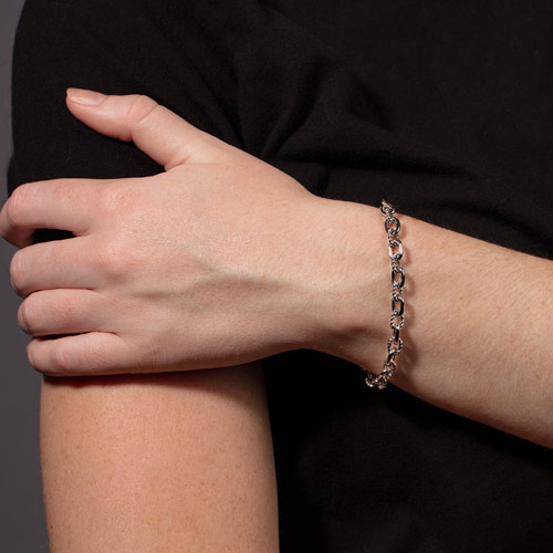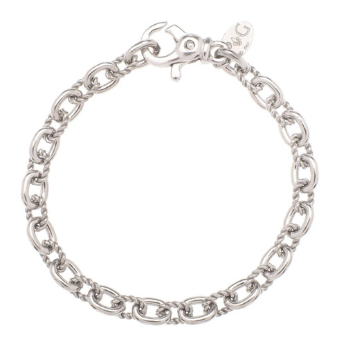 This ladies' Phillip Gavriel sterling silver bracelet has textured and polished oval cable links. Bracelet length: 7 inches. Link width: 6mm. Lobster clasp. Gift boxed. Approximate weight: 13.8 grams. Made in Italy. Ships from USA.