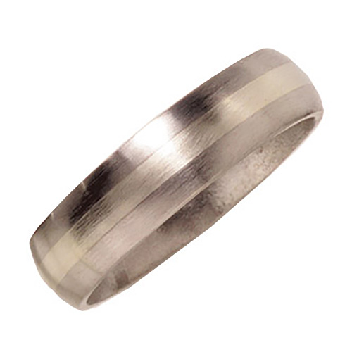 Ti™ satin titanium wedding band with domed center. 2mm 14kt white gold inlay. Ring width: 6mm. Hypoallergenic, comfort fit styling. Limited lifetime guarantee: All Ti™ jewelry is guaranteed for life. If a piece should EVER fail structually, it will be replaced at no charge.