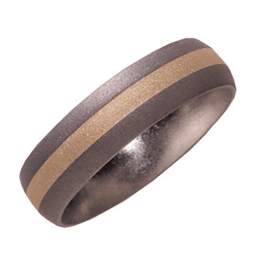 Ti titanium wedding band with domed center. Sandblast finish. 2mm 14kt yellow gold inlay. Ring width: 6mm. Hypoallergenic, comfort fit styling. Limited lifetime guarantee: All Ti jewelry is guaranteed for life. If a piece should EVER fail structually, it will be replaced at no charge.