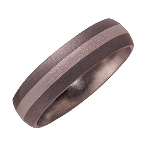 Ti titanium wedding band with domed center. Sandblast finish. 2mm platinum inlay. Ring width: 6mm; thickness: 2.65mm. Hypoallergenic, comfort fit styling. Limited lifetime guarantee: All Ti jewelry is guaranteed for life. If a piece should EVER fail structually, it will be replaced at no charge.