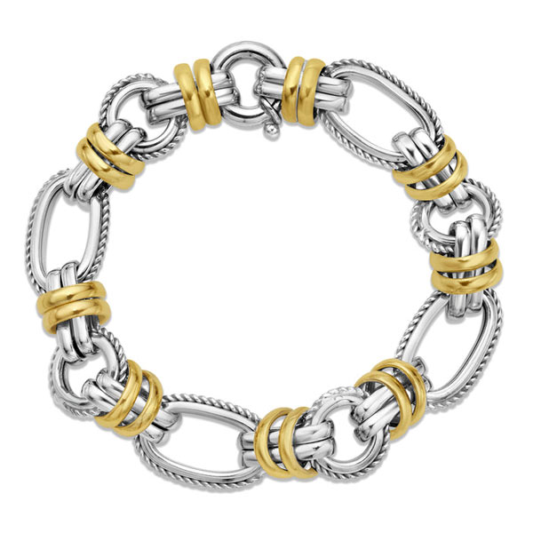 Italian craftsmanship meets this season's two-tone trend in this ladies' Phillip Gavriel contessa bracelet. The large twisted oval and round sterling siver links are joined by smaller 18k yellow gold cable links. Bracelet length: 8in. Bracelet width: 0.5in. The bracelet is secured with a large spring ring clasp. Approximate weight: 29.0 grams. Made in Italy. Ships from USA.