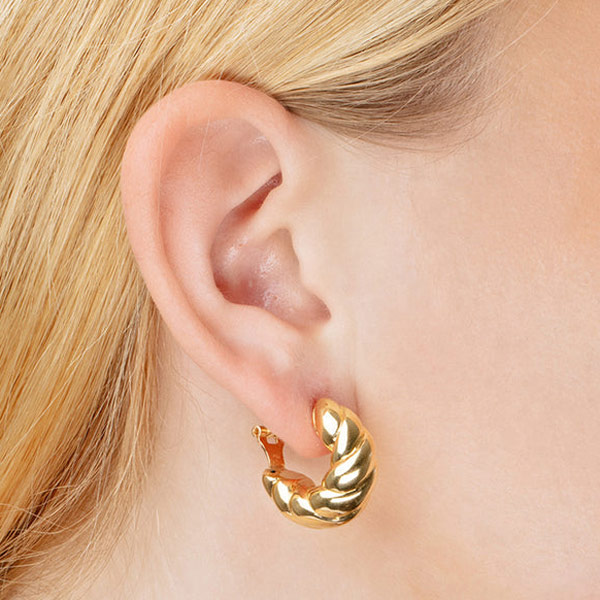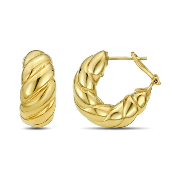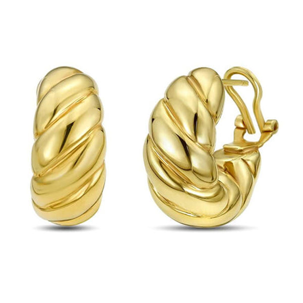 These bold 14k yellow gold sculpted cable hoop earrings have omega backs. Earring size: 22mm x 25mm. Thickness: 10mm. Approximate weight: 5.1 grams. Made in Italy. Ships from USA.