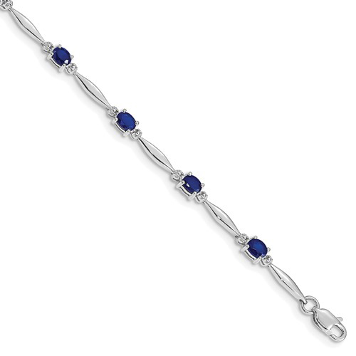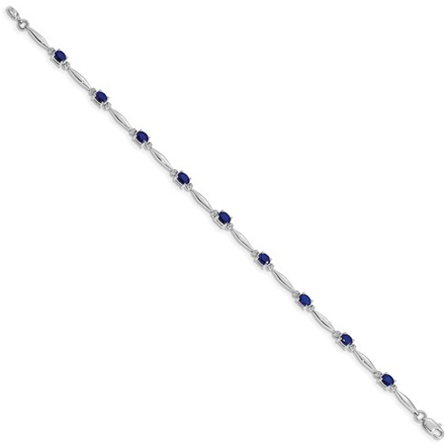 14k white gold 1.98 carat total weight genuine blue sapphire bracelet has tapered links. Sapphire details: nine 4mm x 3mm oval genuine blue sapphires. Lobster clasp. Bracelet length: 7.25in, link width: 4.5mm. Rhodium-plated. Weight: 4.5 grams. Made in India.