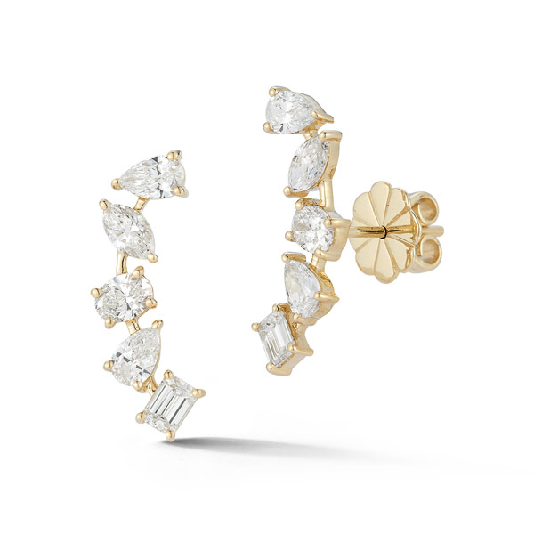 These solid 14k yellow gold diamond ear climbers are adorned with genuine diamonds of different shapes. There are two emerald-cut diamonds, two pear shaped diamonds, two oval cut diamonds, and four pear-cut diamonds. 1.32 carat total weight, SI2 clarity, G-H color, eye clean. Posts with push on / pull off backs. Made in USA.
