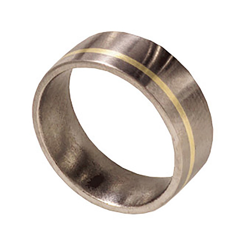Ti™ titanium wedding band with 1mm 14kt yellow gold inlay off center. Satin finish. Ring width: 8mm. Hypoallergenic, comfort fit styling. Limited lifetime guarantee: All Ti™ jewelry is guaranteed for life. If a piece should EVER fail structually, it will be replaced at no charge.
