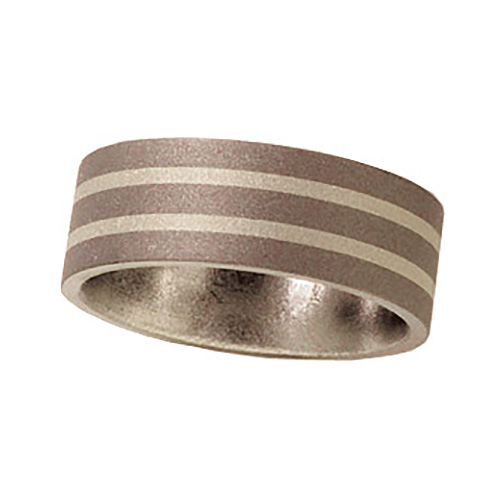 Ti™ titanium wedding band. Sandblast finish. Two 1mm 14kt yellow gold inlays. Ring width: 8mm. Hypoallergenic, comfort fit styling. Limited lifetime guarantee: All Ti™ jewelry is guaranteed for life. If a piece should EVER fail structually, it will be replaced at no charge.