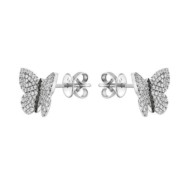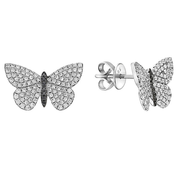 14k white gold black and white diamond butterfly earrings bring whimsy and elegance all at once. The earrings are set with 14 black diamonds weighing 0.04 carats and 188 round diamonds weighing 0.64 carats. Posts with push on / pull off backs. Approximate weight: 2.6 grams. Ships from USA.