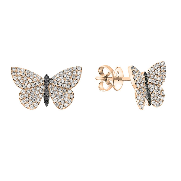 14k yellow gold black and white diamond butterfly earrings bring whimsy and elegance all at once. The earrings are set with 14 black diamonds weighing 0.04 carats and 188 round diamonds weighing 0.64 carats. Posts with push on / pull off backs. Approximate weight: 2.6 grams. Ships from USA.